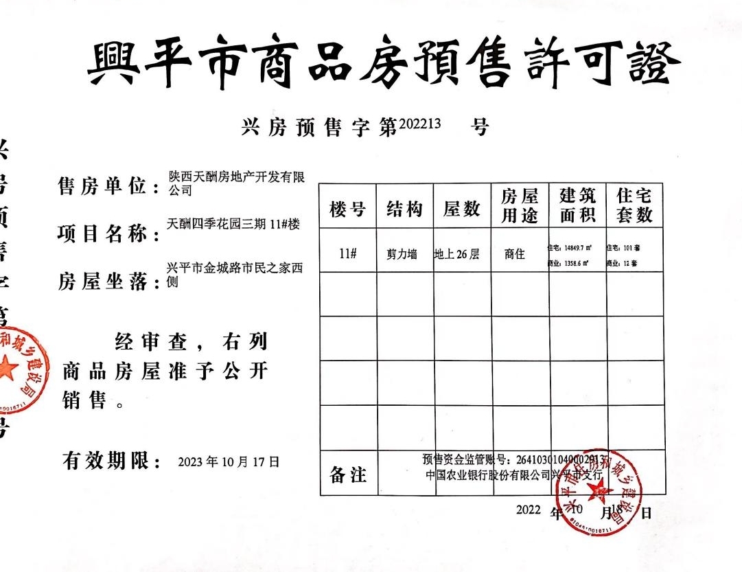 金色十月秋意浓,丹桂飘香送捷讯。10月27日,陕西天酬房地产开发有限公司顺利取得11#、13#楼预售许可证。