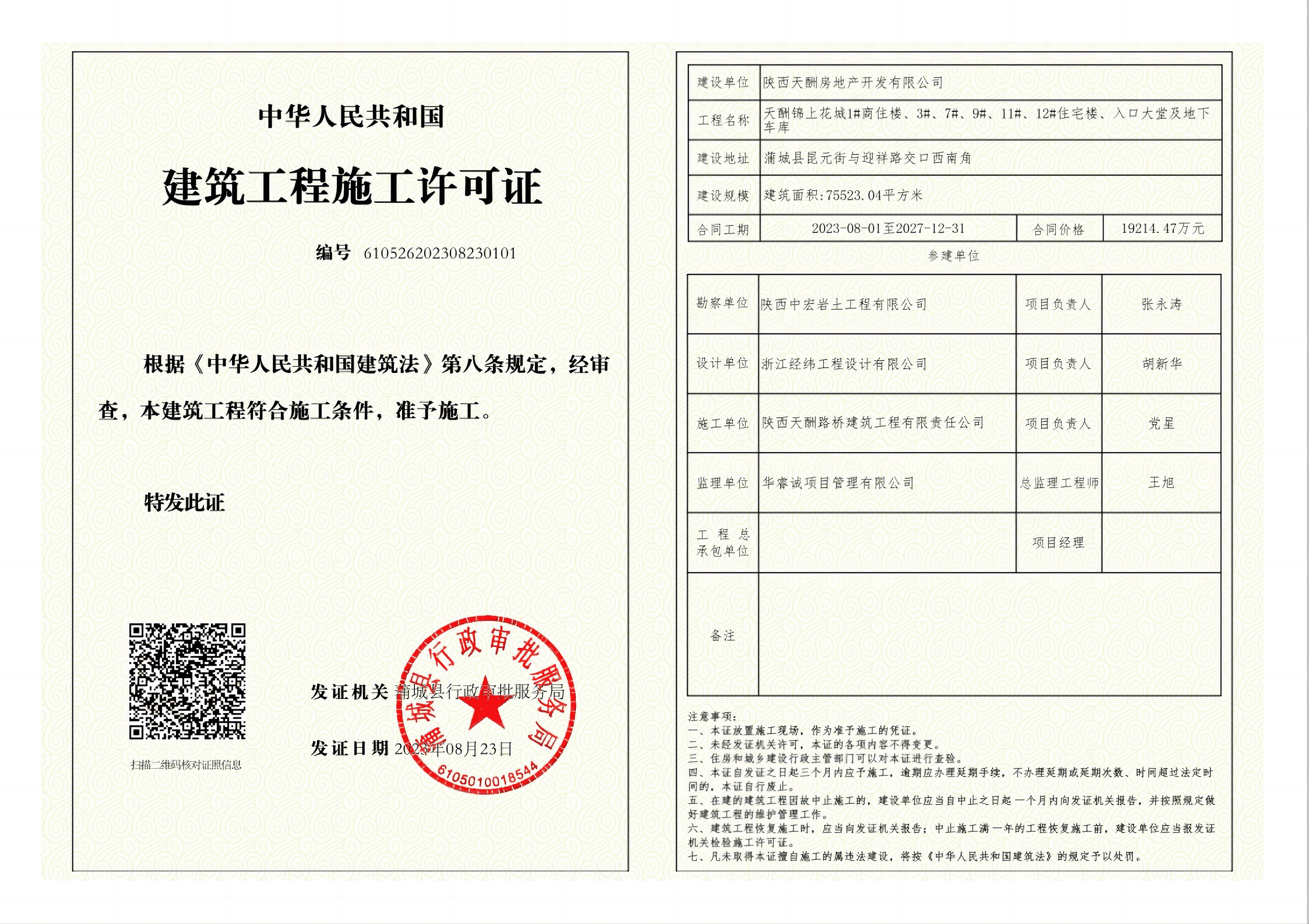 陕外集团天酬建业公司所属房地产公司蒲城锦上花城二期项目取得《建筑工程施工许可证》