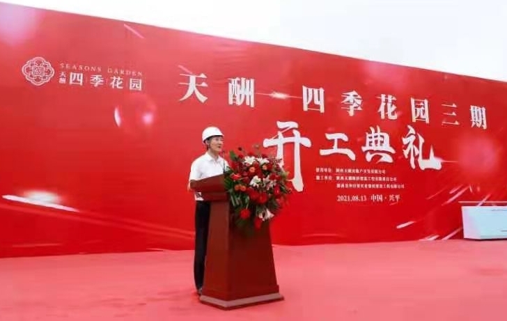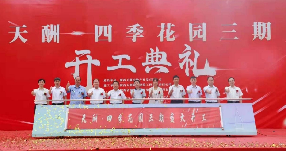 8月13日上午,天酬·四季花园三期项目隆重举行开工仪式。兴平市自然资源局副局长韩三会,不动产登记中心科长康亚莉、段晓娟;陕西省外经贸实业集团有限公司党委副书记、工会主席刘浩川,党委委员、董事丁永忠,副总经理任军民,总会计师郭学鹏;陕西秦岭航空电气有限责任公司党委书记、总经理于亮;陕西省外经贸实业集团建设工程有限公司党委书记、董事长杨学斌,党委副书记、董事、总经理杜立波;陕西天酬建业有限责任公司党支部书记、董事长李满星,党支部副书记、总经理汪虹,副总经理王根利、陈肖峰等领导和各参建单位代表共计150余人参加了本次活动,共同见证这一重要时刻。