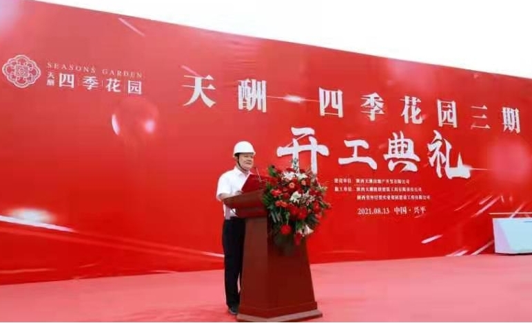 随着一段气势恢宏的击鼓表演,拉开了此次活动的序幕。天酬公司总经理汪虹代表公司对兴平市各级领导、集团公司各位领导和兄弟单位各位同仁的到来以及长期的关心和支持表示诚挚感谢。在介绍了天酬·四季花园三期项目的基本情况后,汪总表示:在项目开发建设中,将与陕外建设公司以诚相待,全力协作,严守施工规范,严控施工过程,严把安全、质量关。秉承“天道酬勤、负重精进,以义为利、立质图存”的企业文化和建设理念,与各参建单位一道,和衷共济,为推进陕外经贸集团“十四五”规划落地,实现高质量发展;为共建“汉风唐韵、人文兴平”,助力兴平经济社会发展,提升人居生活品质,再添新业绩。