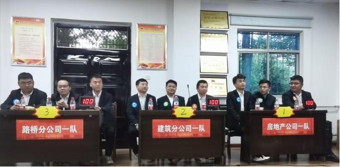 比赛共有房地产公司一队、二队,建筑分公司一队、二队,路桥分公司一队、二队六支代表队参赛,选手们个个精神抖擞、准备充分、运筹帷幄,必答题环节从容应对、稳定作答,抢答题环节,拼智、更拼谁出手快、准、狠,各代表队互不相让、你争我夺。激烈比拼后,出现了房地产公司一队和路桥分公司二队分数并列第三的情况,经裁判讨论后,进入附加题环节。两支队伍的选手们开始深思熟虑,商量对策,在比分上竞相追赶,高潮迭起、扣人心弦。现场气氛活跃而又热烈,选手们扎实的知识储备以及毫不示弱的竞赛风貌赢得了现场阵阵掌声。经过一轮轮紧张的角逐,建筑分公司二队获得第一名,路桥分公司一队获得第二名,房地产公司一队获得第三名。