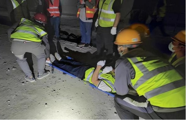 上午10:00,一场隧道坍塌演练迅疾展开。随着一声声急促的哨响,项目部办公室、工地所有施工人员紧急撤离至指定安全区,疏散途中一人不慎摔倒昏迷,救援小组立即上报险情并积极组织救援工作,将受伤人员用担架迅速转移至安全区,医务人员现场实施包扎处置,等待120急救送往医治。与此同时检查险情状况,对现场进行警示防护,消除安全隐患。