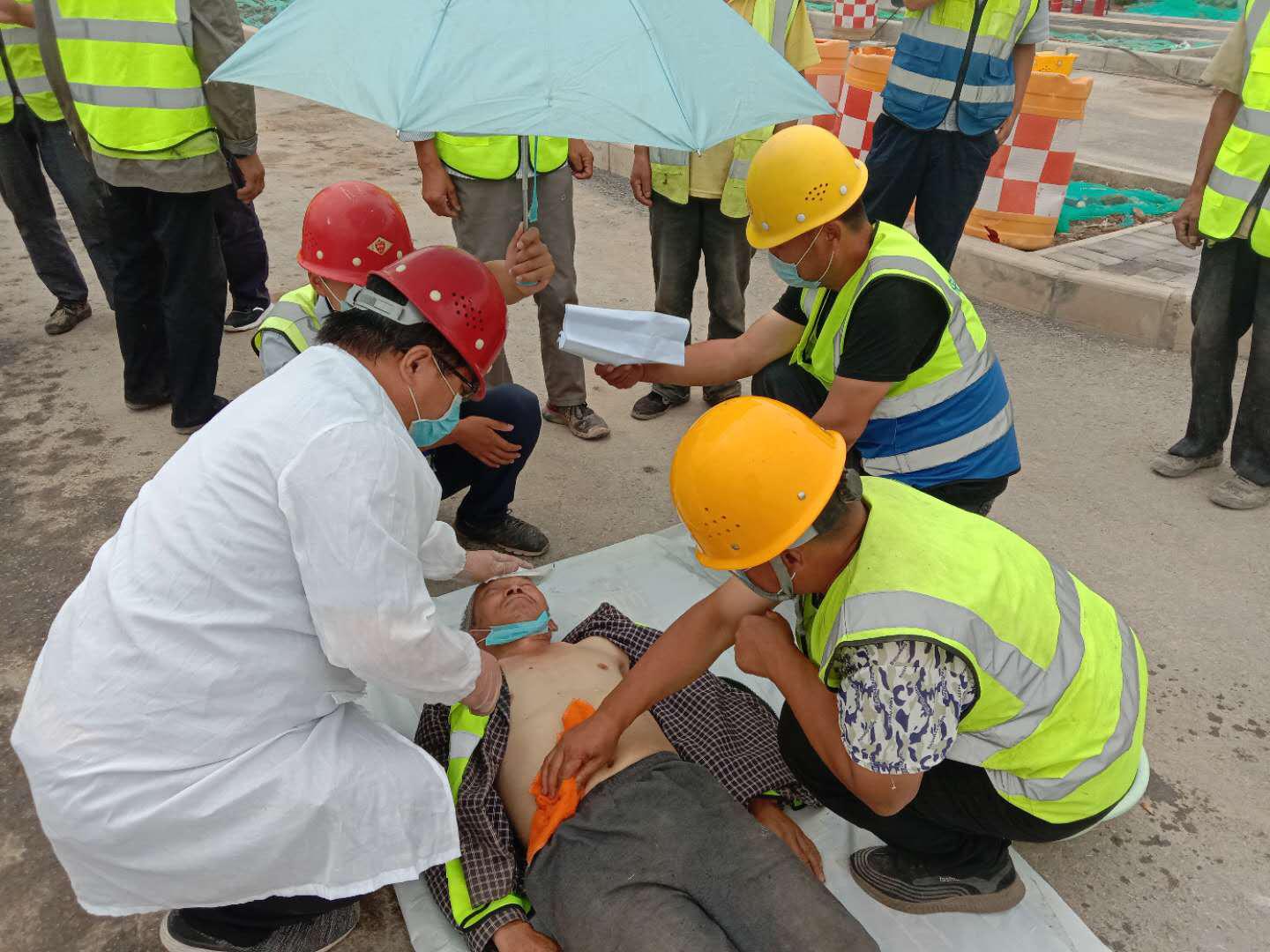本次演练出现了两种情景。在施工过程中,因天气温度过高,致使一名施工人员发生中暑倒地。现场操作人员首先采取自救措施并立即拨打120急救电话,迅速安排现场医护人员将中暑人员运送至阴凉处。在等待救护车的过程中,现场医护人员对中暑人员进行基础的降温处理。