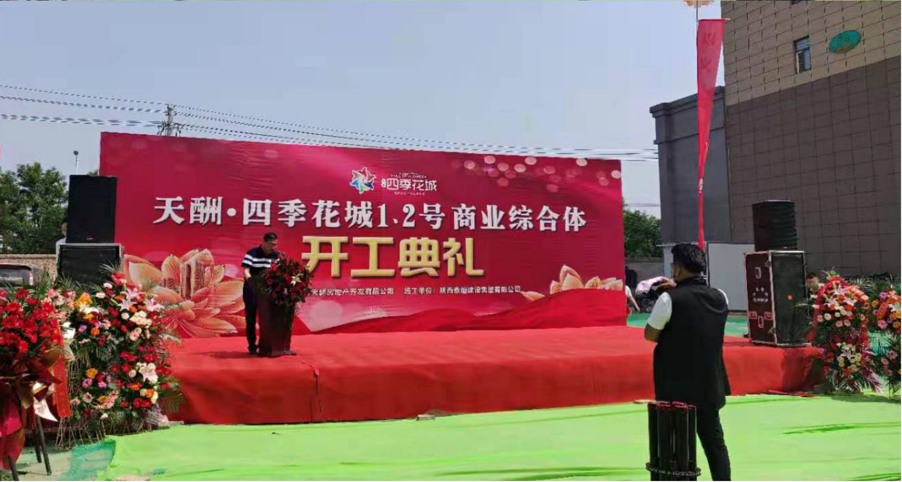 5月13日上午,建设工地上洋溢着一派热烈的气氛,四季花城1#、2#、5A#商业综合体开工仪式在施工现场隆重举行。蒲城县住房和城乡建设局局长韩建军、住建局质检站站长常颇;蒲城县自然资源局代表万新刚;陕西省外经贸实业集团有限公司党委委员、董事丁永忠,副总经理任军民;陕西省外经贸实业集团建设工程有限公司党委书记、董事长杨学斌;陕西省泰烜建设集团有限公司总经理白鸿斌,副总经理程志恒;陕西天酬建业有限责任公司总经理汪虹,副总经理王根利;陕西天酬房地产开发有限公司经理梁美霞;陕西通安项目管理有限公司总经理王圣涛;天酬公司驻蒲所有职工及现场工人共计90余人参加了本次活动,共同见证这一激动人心的时刻。