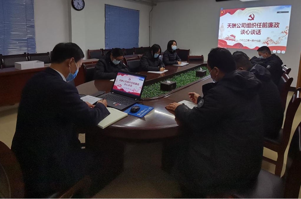 为扎实推进党风廉政建设工作,进一步增强新任干部廉洁自律意识,筑牢拒腐防变的思想防线,2022年1月17日,天酬公司纪检委员、副总经理王根利在公司会议室通过线上与线下相结合的方式对新提任的22名干部进行了任前集体廉政谈话。