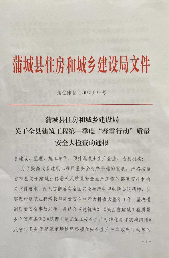为推动蒲城县建筑工程质量、安全平稳有序发展,蒲城县住房和城乡建设局于2022年3月在全县组织开展了建筑工程第一季度“春雷行动”质量安全大检查活动。在本次检查中,由陕西天酬房地产开发有限公司开发,陕西天酬路桥建筑工程有限责任公司承建,陕西华睿诚咨询有限公司监理的“天酬四季花城5#楼项目”在本次评比中脱颖而出,排名第一。