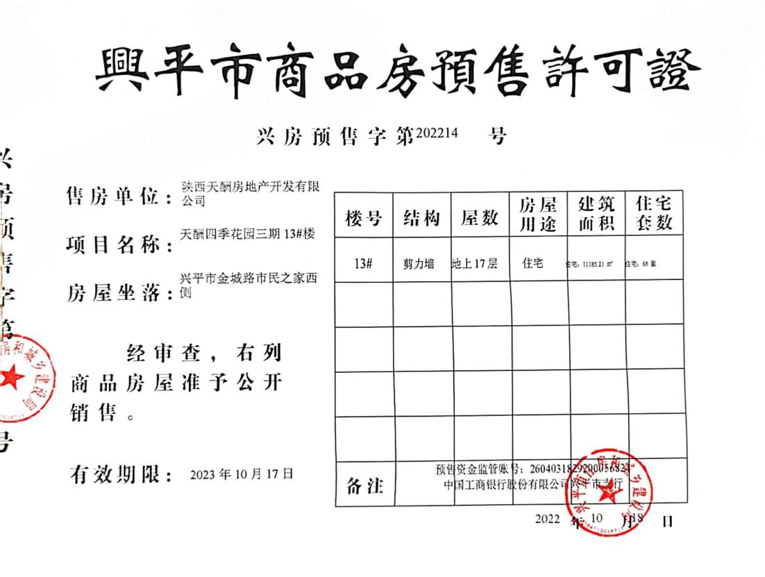 金色十月秋意浓,丹桂飘香送捷讯。10月27日,陕西天酬房地产开发有限公司顺利取得11#、13#楼预售许可证。
