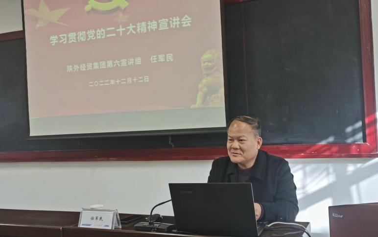 为深入学习贯彻党的二十大精神,进一步凝聚思想共识,根据集团党委统一安排部署,12月12日下午,陕外经贸集团第六宣讲组在天酬公司培训室宣讲党的二十大精神。集团副总经理任军民作宣讲报告。公司领导班子成员、中层副职以上管理人员及职工代表参加会议。