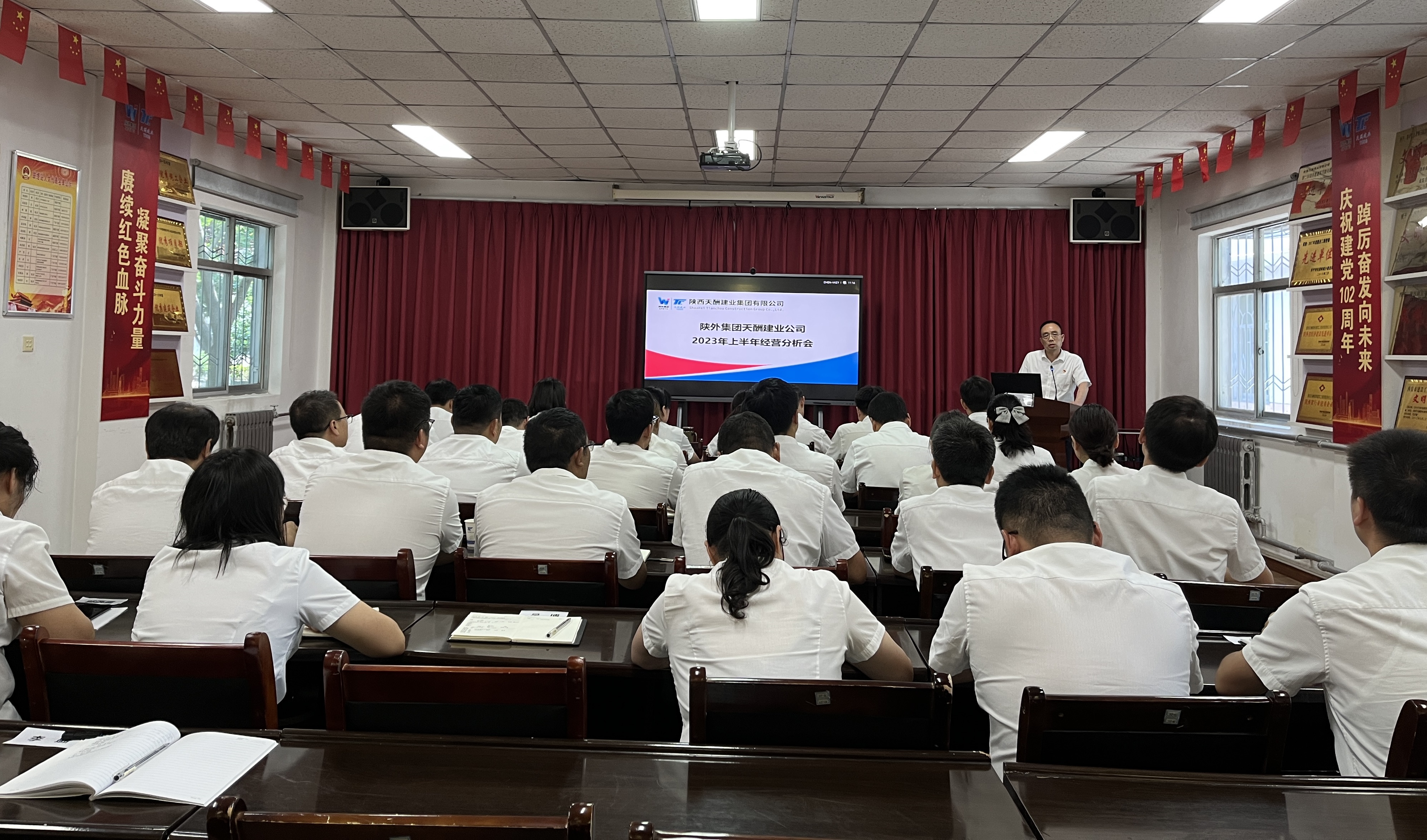 7月26日,陕外集团天酬建业公司召开2023年上半年经营工作分析会,公司党支部书记、董事长李满星,领导班子成员,各单位负责人,部分职工代表参会。会议由党支部副书记、总经理汪虹主持。