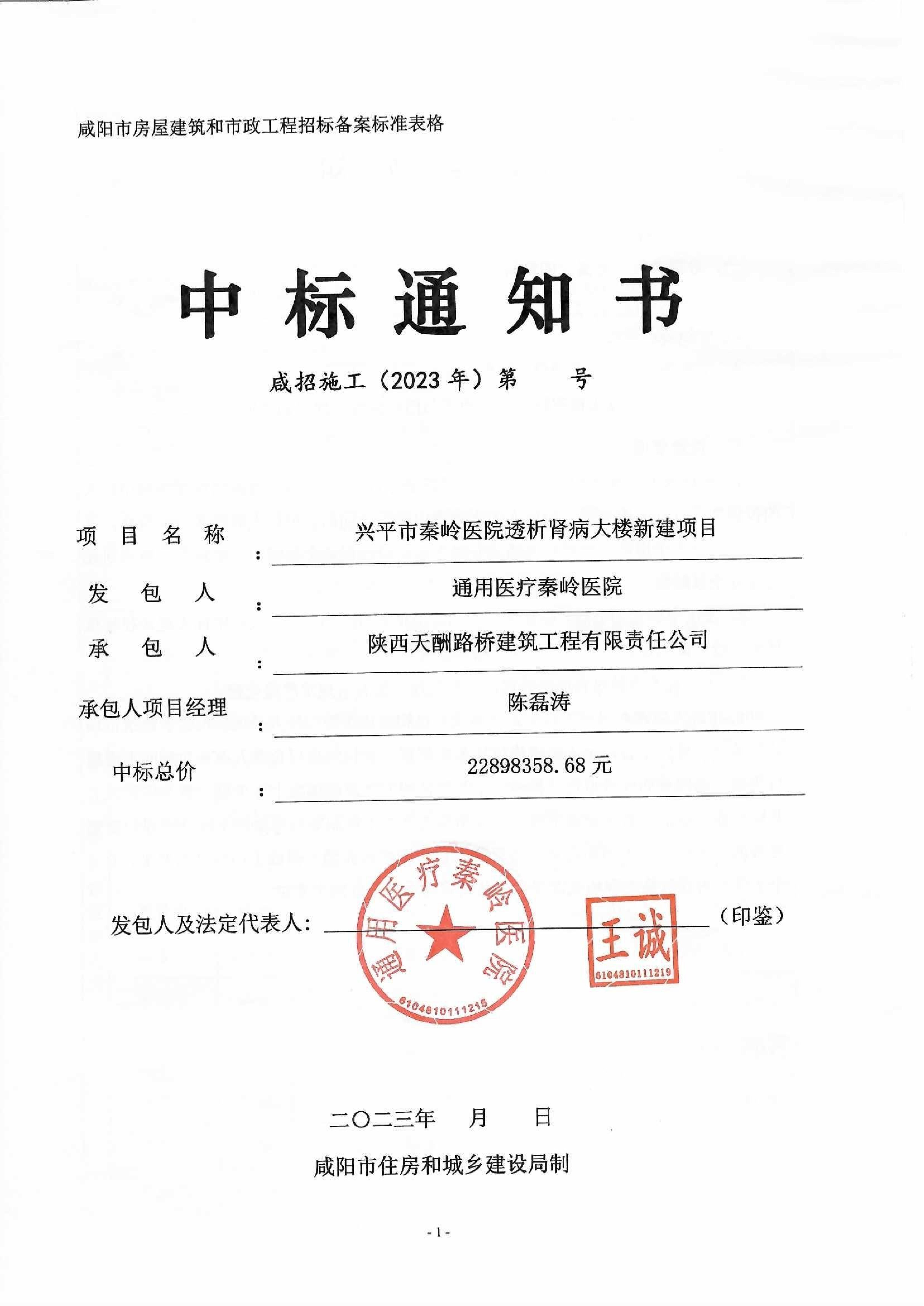 陕外集团天酬建业公司所属建筑分公司成功中标兴平市秦岭医院透析肾病大楼建设项目